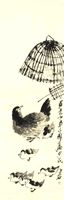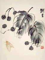 齐白石在绘画艺术上受陈师曾影响甚大,他同时吸取吴昌硕之长。他专长花鸟,笔酣墨饱,力健有锋。但画虫则一丝不苟,极为精细。他还推崇徐渭、朱耷、石涛、金农。尤工虾蟹、蝉、蝶、鱼、鸟、水墨淋漓,洋溢着自然界生气勃勃的气息。山水构图奇异不落旧蹊,极富创造精神,篆刻独出手眼,书法卓然不群,蔚为大家。齐白石的画,反对不切实际的空想,他经常注意花、鸟、虫、鱼的特点,揣摹它们的精神。他曾说:为万虫写照,为百鸟张神,要自己画出自己的面目。他的题句非常诙谐巧妙,他画的两只小鸡争夺一条小虫,题曰;“他日相呼”。一幅《棉花图》题曰:“花开天下暖,花落天下寒”。《不倒翁图》题“秋扇摇摇两面白,官袍楚楚通身黑。”